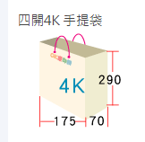手提袋印刷为单面四色或单面单色印刷 手提袋棉绳配色为同系色,提绳标准为30cm可再加長,45cm、60cm、75cm、90cm,价格另计。圆棉绳可换宽棉绳每个提袋加收0.4元,手提袋洞眼大铜扣,增加负重每个提袋加0.4元,手提袋的糊份为3cm,手提袋一般在8-9天交件,打铜扣多加2天。四色黑易造成背印,不得以此为退货理由,请勿使用四色黑的填色或四色总值超过250%以上的填色,以免油墨慢干造成背印的情况。底图填色请勿低于7%,否则颜色太浅无法印出。框线设定至少0.25pt / 0.076mm以上才能印出。